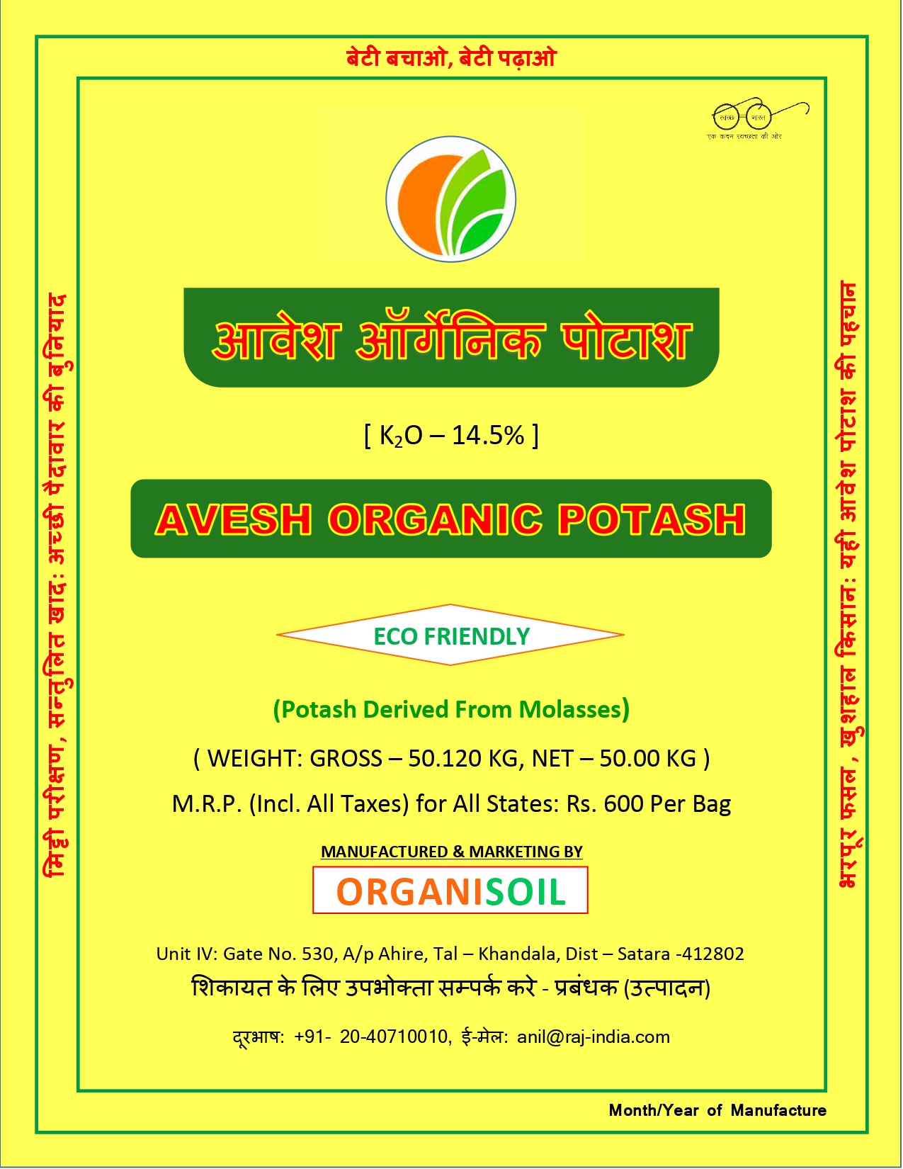 AVESH POTASH 14.5% Potash derived from Molasses Potassium encourages plants to adjust in all kind of weather conditions, strengthen stalks and absorb more nutrients. Potash is found in plant-available form as potassium (K) salts such as potassium chloride, sulphate, nitrate etc. These natural deposits are generally the result of the drying out of seas millions of years ago. In soils and plants these salts, which are all water soluble, separate into the potassium cation K+ and the relevant anion Cl–, SO42-, NO3– etc. Potash in manures is also mainly (70-90%) in water soluble form, with a small amount bound into the organic material which is released into the soil solution as the organic matter is mineralised.